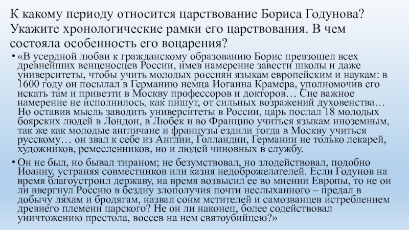«В усердной любви к гражданскому образованию Борис превзошел всех древнейших венценосцев России, имев намерение завести школы и даже университеты, чтобы учить молодых россиян языкам европейским и наукам: в 1600 году он посылал в Германию немца Иоганна Крамера, уполномочив его искать там и привезти в Москву профессоров и докторов… Сие важное намерение не исполнилось, как пишут, от сильных возражений духовенства… Но оставив мысль заводить университеты в России, царь послал 18 молодых боярских людей в Лондон, в Любек и во Францию учиться языкам иноземным, так же как молодые англичане и французы ездили тогда в Москву учиться русскому… он звал к себе из Англии, Голландии, Германии не только лекарей, художников, ремесленников, но и людей чиновных в службу.