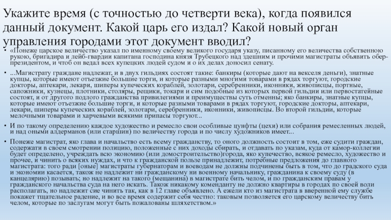 «Понеже царское величество указал по именному своему великого государя указу, писанному его величества собственною рукою, бригадира и лейб-гвардии капитана господина князя Трубецкого над здешним и прочими магистраты объявить обер-президентом, и чтоб он ведал всех купецких людей судом и о их делах доносил сенату.