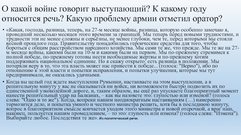 Когда вы целый год ждете выступления Румынии, настаиваете на этом выступлении, а в решительную минуту у вас не оказывается ни войск, ни возможности быстро подвозить их по единственной узкоколейной дороге, и, таким образом, вы ещё раз упускаете благоприятный момент нанести решительный удар на Балканах, – как вы назовете это: глупостью или изменой? (голоса слева: "Одно и то же"). Когда, вопреки нашим неоднократным настаиваниям (…) намеренно тормозится дело, и попытка умного и честного министра решить, хотя бы в последнюю минуту, вопрос в благоприятном смысле кончается уходом этого министра и новой отсрочкой, а враг наш, наконец, пользуется нашим промедлением, – то это: глупость или измена? (голоса слева: "Измена"). Выбирайте любое. Последствия те же». Из политической речи.