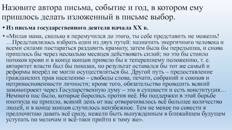 «Милая мама, сколько я перемучился до этого, ты себе представить не можешь! …Представлялось избрать один из двух путей: назначить энергичного человека и всеми силами постараться раздавить крамолу, затем была бы передышка, и снова пришлось бы через несколько месяцев действовать силой; но это бы стоило потоков крови и в конце концов привело бы к теперешнему положению, т. е. авторитет власти был бы показан, но результат оставался бы тот же самый и реформы вперёд не могли осуществляться бы. Другой путь – предоставление гражданских прав населению – свободы слова, печати, собраний и союзов и неприкосновенности личности; кроме того, обязательство проводить всякий законопроект через Государственную думу – это в сущности и есть конституция… Немного нас было, которые боролись против неё. Но поддержки в этой борьбе ниоткуда не пришло, всякий день от нас отворачивалось всё большее количество людей, и в конце концов случилось неизбежное. Тем не менее по совести я предпочитаю давать всё сразу, нежели быть вынужденным в ближайшем будущем уступать по мелочам и всё-таки прийти к тому же».