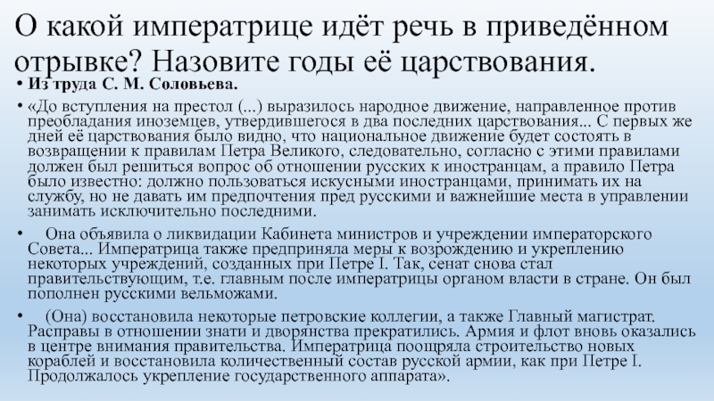 Она объявила о ликвидации Кабинета министров и учреждении императорского Совета... Императрица также предприняла меры к возрождению и укреплению некоторых учреждений, созданных при Петре I. Так, сенат снова стал правительствующим, т.е. главным после императрицы органом власти в стране. Он был пополнен русскими вельможами.