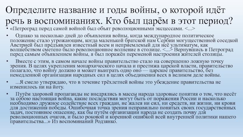 Путём здоровой пропаганды не внедрялись в массы народа здоровые понятия о том, что несёт за собою настоящая война, какие последствия могут быть от поражения России и насколько необходимо дружное содействие всех граждан, не жалея ни сил, ни средств, ни жизни, ни крови для достижения победы. Ошибочная точка зрения неправильно понятых своих государственных задач, постоянное опасение, как бы путём организации народа не создать почву для революционных очагов, и было роковой и коренной ошибкой всей внутренней политики нашего правительства...» Из воспоминаний Родзянко.