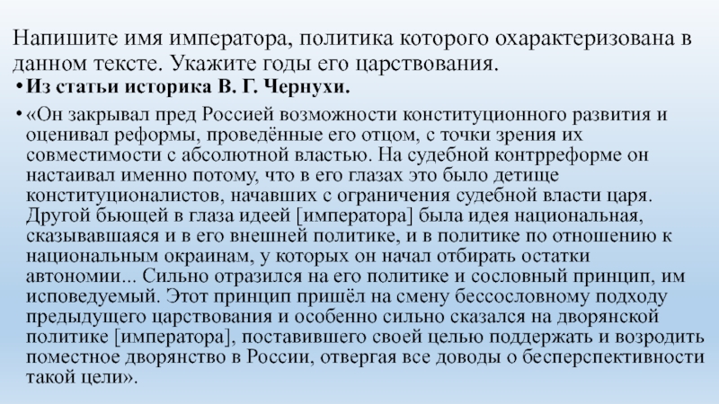 «Он закрывал пред Россией возможности конституционного развития и оценивал реформы, проведённые его отцом, с точки зрения их совместимости с абсолютной властью. На судебной контрреформе он настаивал именно потому, что в его глазах это было детище конституционалистов, начавших с ограничения судебной власти царя. Другой бьющей в глаза идеей [императора] была идея национальная, сказывавшаяся и в его внешней политике, и в политике по отношению к национальным окраинам, у которых он начал отбирать остатки автономии... Сильно отразился на его политике и сословный принцип, им исповедуемый. Этот принцип пришёл на смену бессословному подходу предыдущего царствования и особенно сильно сказался на дворянской политике [императора], поставившего своей целью поддержать и возродить поместное дворянство в России, отвергая все доводы о бесперспективности такой цели».