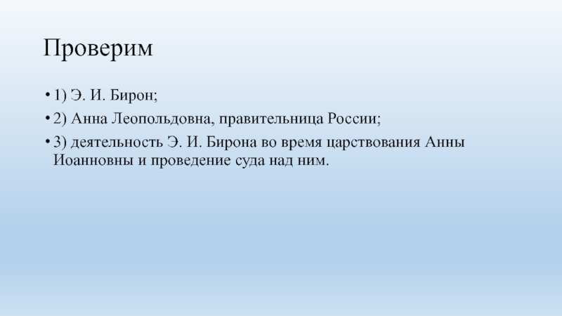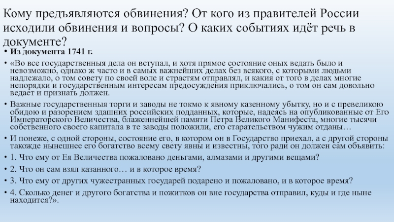 «Во все государственныя дела он вступал, и хотя прямое состояние оных ведать было и невозможно, однако ж часто и в самых важнейших делах без всякого, с которыми людьми надлежало, о том совету по своей воле и страстям отправлял, и какия от того в делах многие непорядки и государственным интересам предосуждения приключались, о том он сам довольно ведает и признать должен.