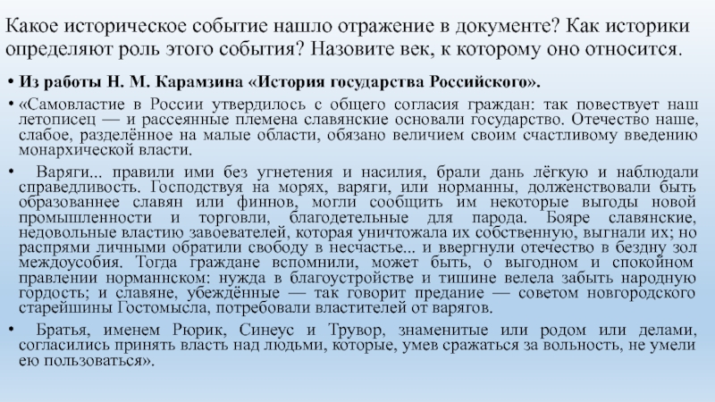 Варяги... правили ими без угнетения и насилия, брали дань лёгкую и наблюдали справедливость. Господствуя на морях, варяги, или норманны, долженствовали быть образованнее славян или финнов, могли сообщить им некоторые выгоды новой промышленности и торговли, благодетельные для парода. Бояре славянские, недовольные властию завоевателей, которая уничтожала их собственную, выгнали их; но распрями личными обратили свободу в несчастье... и ввергнули отечество в бездну зол междоусобия. Тогда граждане вспомнили, может быть, о выгодном и спокойном правлении норманнском: нужда в благоустройстве и тишине велела забыть народную гордость; и славяне, убеждённые — так говорит предание — советом новгородского старейшины Гостомысла, потребовали властителей от варягов.
