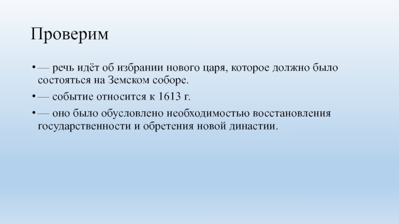 «Кандидатура представителя семьи Романовых устраивала разные слои населения и даже классы общества. Для боярства Романовы были свои — выходцы из одного из самых знатных боярских родов страны. Их считали своими и те, кто был близок к опричному двору... но и пострадавшие не чувствовали себя чуждыми этому семейству; среди его членов встречались казненные и опальные в годы опричнины, сам Филарет оказался в сеннике при бывшем опричнике Борисе Годунове. Наконец, Романовы пользовались большой популярностью среди казачества, с ним связывались многие иллюзии, и длительное пребывание Филарета в Тушине... заставляло и бывших тушинцев не опасаться за свою судьбу при новом правительстве. Поскольку Филарет возглавил в своё время делегацию, которая пригласила на русский трон Владислава, то и сторонники польского королевича не беспокоились за своё буду шее при Романовых».