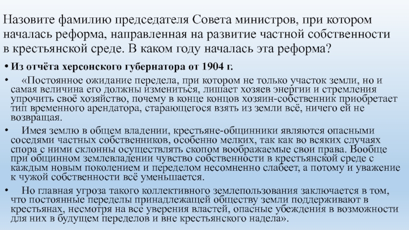 Но главная угроза такого коллективного землепользования заключается в том, что постоянные переделы принадлежащей обществу земли поддерживают в крестьянах, несмотря на все уверения властей, опасные убеждения в возможности для них в будущем переделов и вне крестьянского надела».