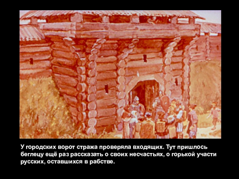 Слайд 20У городских ворот стража проверяла входящих. Тут пришлось беглецу ещё раз