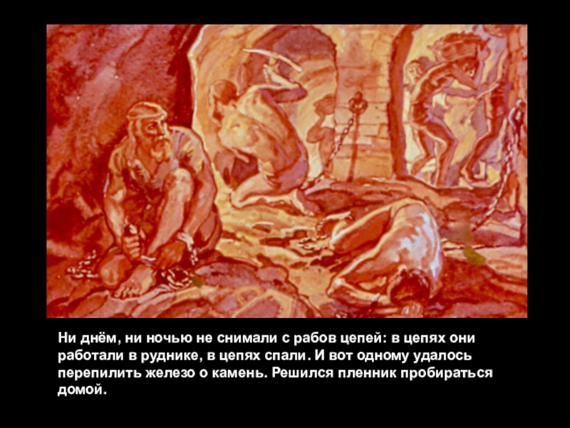 они работали в руднике, в цепях спали. И вот одному удалось перепилить железо о камень. Решился пленник пробираться домой.