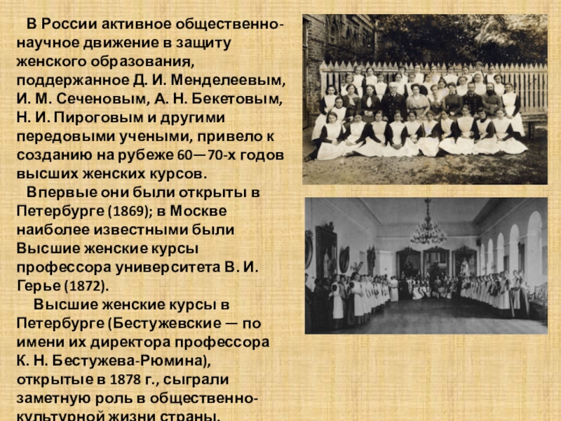 поддержанное Д. И. Менделеевым, И. М. Сеченовым, А. Н. Бекетовым, Н. И. Пироговым и другими передовыми учеными, привело к созданию на рубеже 60—70-х годов высших женских курсов.
