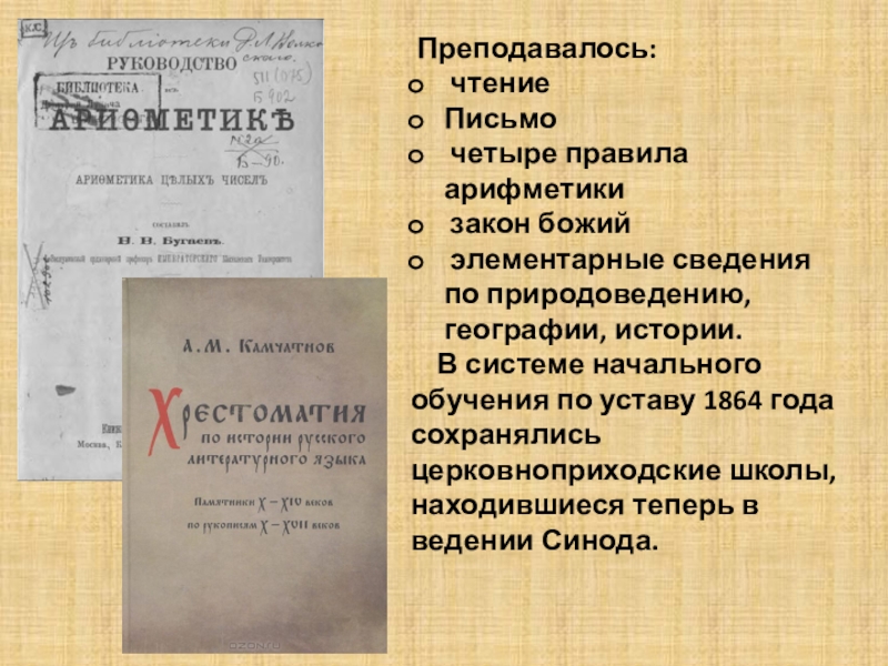 В системе начального обучения по уставу 1864 года сохранялись церковноприходские школы, находившиеся теперь в ведении Синода.