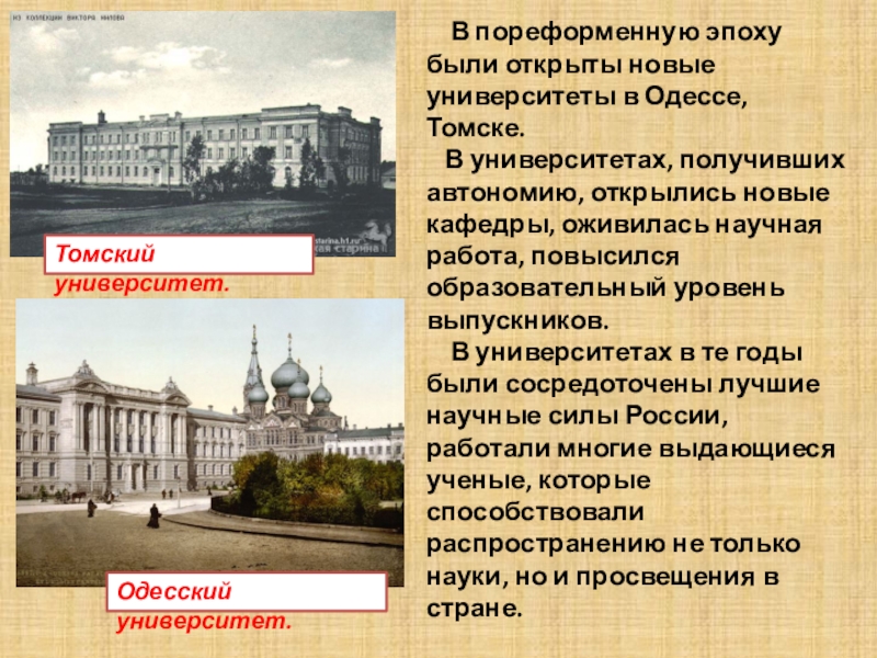 Слайд 8 В пореформенную эпоху были открыты новые университеты в Одессе,