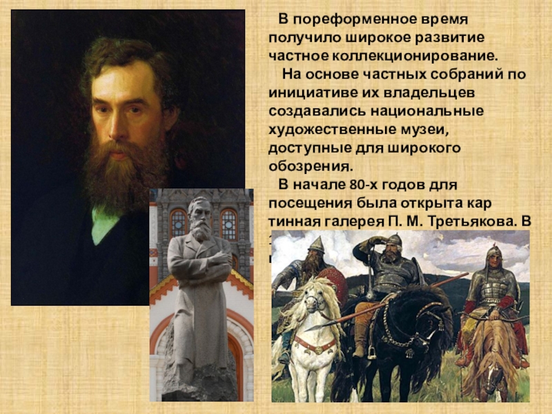 В начале 80-х годов для посещения была открыта кар тинная галерея П. М. Третьякова. В 1893 г. он передал собрание своих картин в дар Москве.