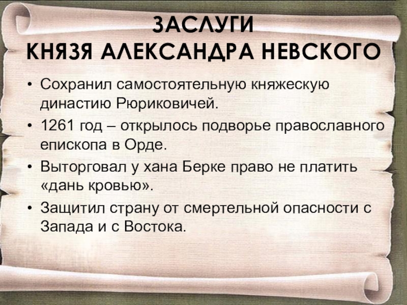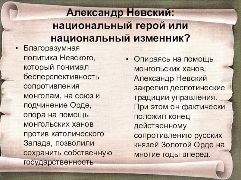 Опираясь на помощь монгольских ханов, Александр Невский закрепил деспотические традиции управления. При этом он фактически положил конец действенному сопротивлению русских князей Золотой Орде на многие годы вперед.