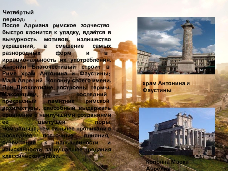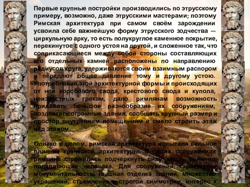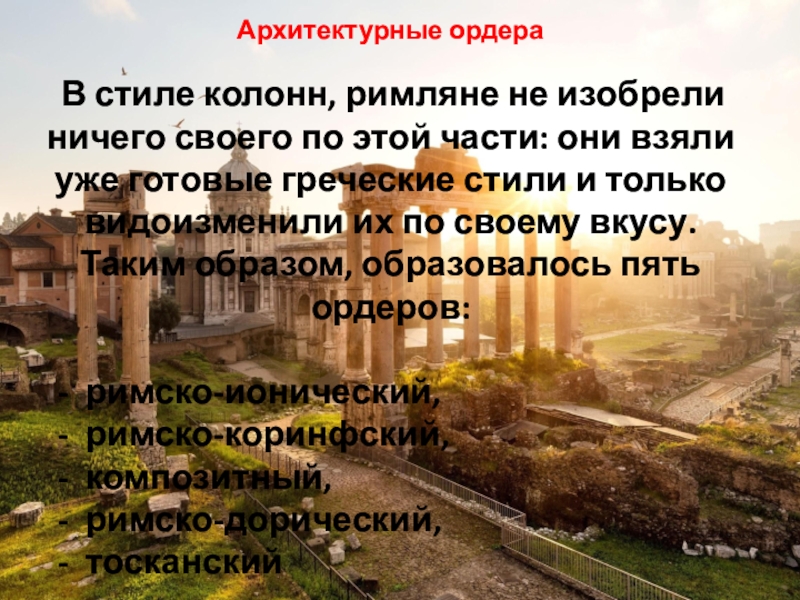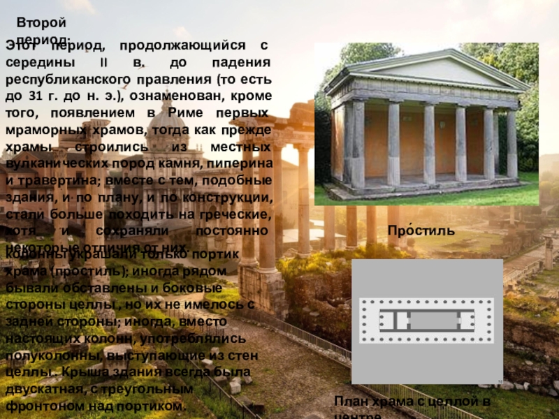 колонны украшали только портик храма (простиль); иногда рядом бывали обставлены и боковые стороны целлы , но их не имелось с задней стороны; иногда, вместо настоящих колонн, употреблялись полуколонны, выступающие из стен целлы . Крыша здания всегда была двускатная, с треугольным фронтоном над портиком.