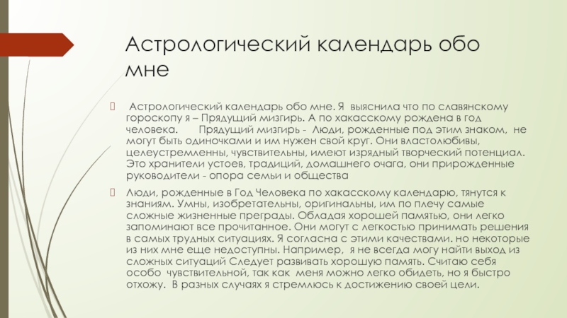 Люди, рожденные в Год Человека по хакасскому календарю, тянутся к знаниям. Умны, изобретательны, оригинальны, им по плечу самые сложные жизненные преграды. Обладая хорошей памятью, они легко запоминают все прочитанное. Они могут с легкостью принимать решения в самых трудных ситуациях. Я согласна с этими качествами. но некоторые из них мне еще недоступны. Например, я не всегда могу найти выход из сложных ситуаций Следует развивать хорошую память. Считаю себя особо чувствительной, так как меня можно легко обидеть, но я быстро отхожу. В разных случаях я стремлюсь к достижению своей цели.