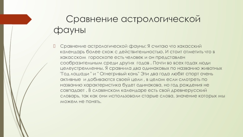 хакасский календарь более схож с действительностью. И стоит отметить что в хакасском гороскопе есть человек и он представлен сообразительным среди других годов . Почти во всех годах люди целеустремленны. Я сравнила два одинаковых по названию животных "Год лошади " и " Огнегривый конь" Эти два года любят спорт очень активные и добиваются своей цели , в целом если смотреть по названию характеристика будет одинакова, но год рождения не совпадает . В славянском календаре есть свой древнерусский словарь, так как они использовали старые слова, значение которых мы можем не понять.