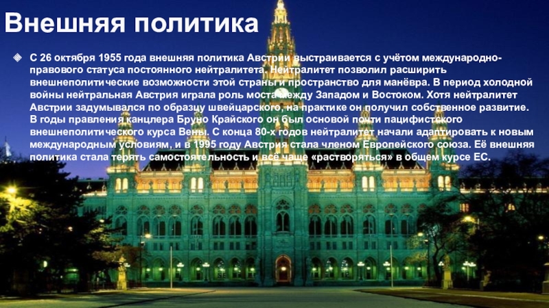 учётом международно-правового статуса постоянного нейтралитета. Нейтралитет позволил расширить внешнеполитические возможности этой страны и пространство для манёвра. В период холодной войны нейтральная Австрия играла роль моста между Западом и Востоком. Хотя нейтралитет Австрии задумывался по образцу швейцарского, на практике он получил собственное развитие. В годы правления канцлера Бруно Крайского он был основой почти пацифистского внешнеполитического курса Вены. С конца 80-х годов нейтралитет начали адаптировать к новым международным условиям, и в 1995 году Австрия стала членом Европейского союза. Её внешняя политика стала терять самостоятельность и всё чаще «растворяться» в общем курсе ЕС.