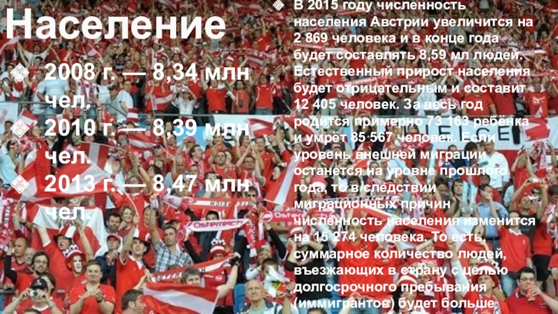 В 2015 году численность населения Австрии увеличится на 2 869 человека и в конце года будет составлять 8,59 мл людей. Естественный прирост населения будет отрицательным и составит 12 405 человек. За весь год родится примерно 73 163 ребёнка и умрёт 85 567 человек. Если уровень внешней миграции останется на уровне прошлого года, то в следствии миграционных причин численность населения изменится на 15 274 человека. То есть, суммарное количество людей, въезжающих в страну с целью долгосрочного пребывания (иммигрантов) будет больше количества людей, покидающих страну (эмигрантов).