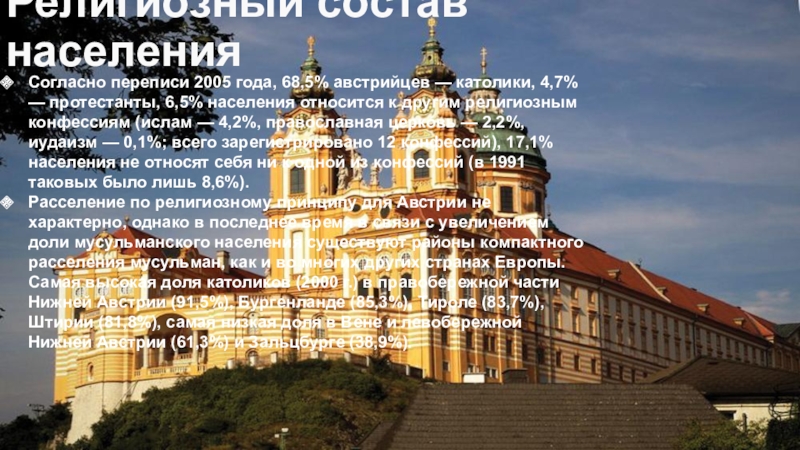 Согласно переписи 2005 года, 68,5% австрийцев — католики, 4,7%