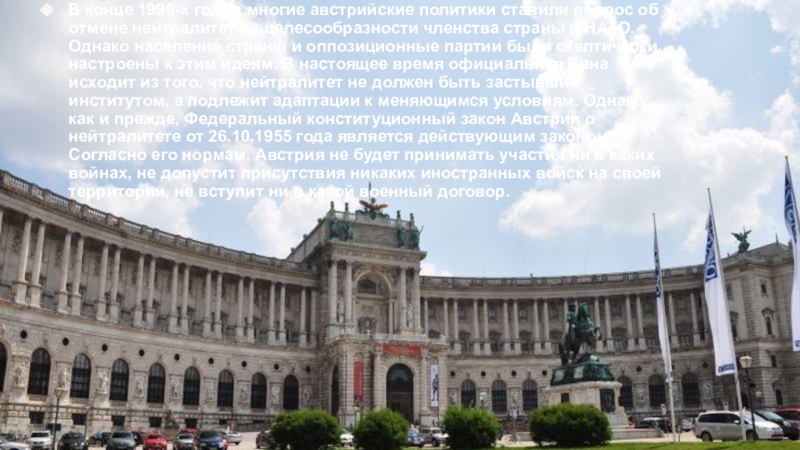 нейтралитета и целесообразности членства страны в НАТО. Однако население страны и оппозиционные партии были скептически настроены к этим идеям. В настоящее время официальная Вена исходит из того, что нейтралитет не должен быть застывшим институтом, а подлежит адаптации к меняющимся условиям. Однако, как и прежде, Федеральный конституционный закон Австрии о нейтралитете от 26.10.1955 года является действующим законом. Согласно его нормам, Австрия не будет принимать участия ни в каких войнах, не допустит присутствия никаких иностранных войск на своей территории, не вступит ни в какой военный договор.
