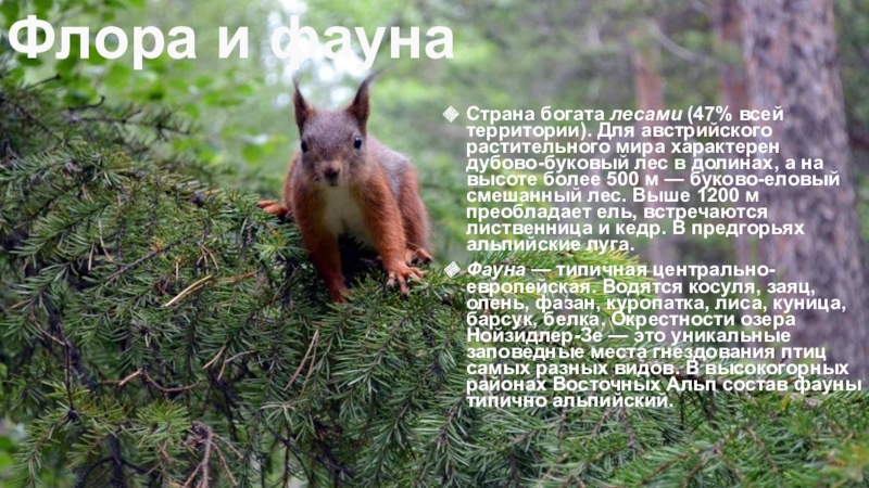 Страна богата лесами (47% всей территории). Для австрийского растительного мира характерен