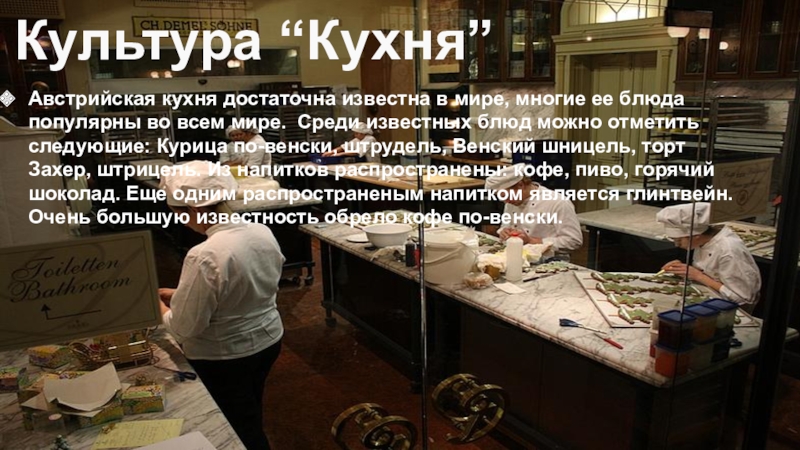 во всем мире. Среди известных блюд можно отметить следующие: Курица по-венски, штрудель, Венский шницель, торт Захер, штрицель. Из напитков распространены: кофе, пиво, горячий шоколад. Еще одним распространеным напитком является глинтвейн. Очень большую известность обрело кофе по-венски.
