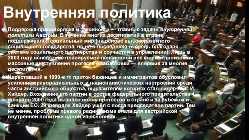 Нараставший в 1990-е гг. приток беженцев и иммигрантов обусловил усиление праворадикальных и националистических настроений среди части австрийского общества, выразителем которых стал лидер АПС Й. Хайдер. Вхождение его партии в состав федерального правительства 4 февраля 2000 года вызвало волну протестов в стране и за рубежом и санкции ЕС. 29 февраля Хайдер ушёл с поста председателя партии. Тем не менее, проблема правого радикализма стала для австрийской внутренней политики одной из основных.