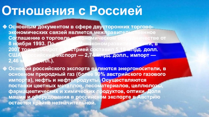Соглашение о торговле и экономическом сотрудничестве от 8 ноября 1993. По данным Минэкономразвития России, в 2007 товарооборот с Австрией составил 5,19 млрд. долл. США (российский экспорт — 2,74 млрд. долл., импорт — 2,46 млрд. долл.).