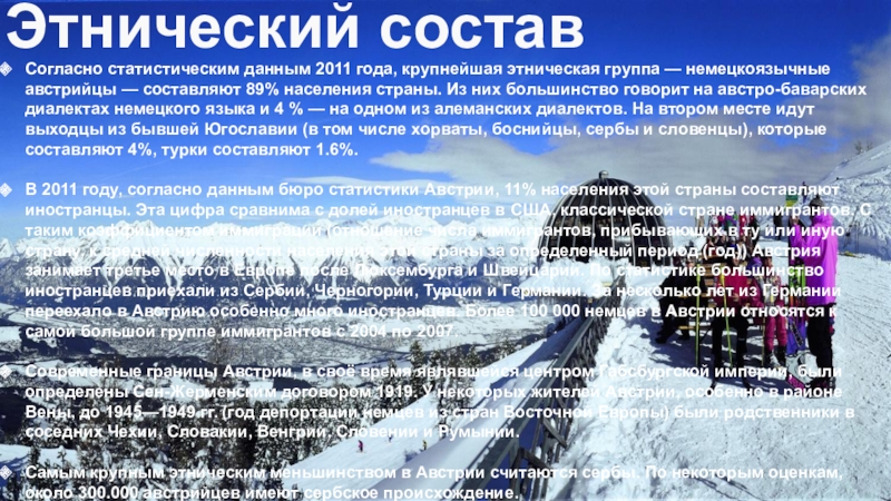 австрийцы — составляют 89% населения страны. Из них большинство говорит на австро-баварских диалектах немецкого языка и 4 % — на одном из алеманских диалектов. На втором месте идут выходцы из бывшей Югославии (в том числе хорваты, боснийцы, сербы и словенцы), которые составляют 4%, турки составляют 1.6%.