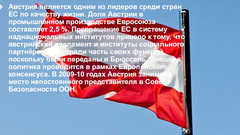 Слайд 11Австрия является одним из лидеров среди стран ЕС по качеству жизни.