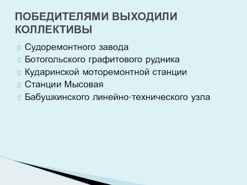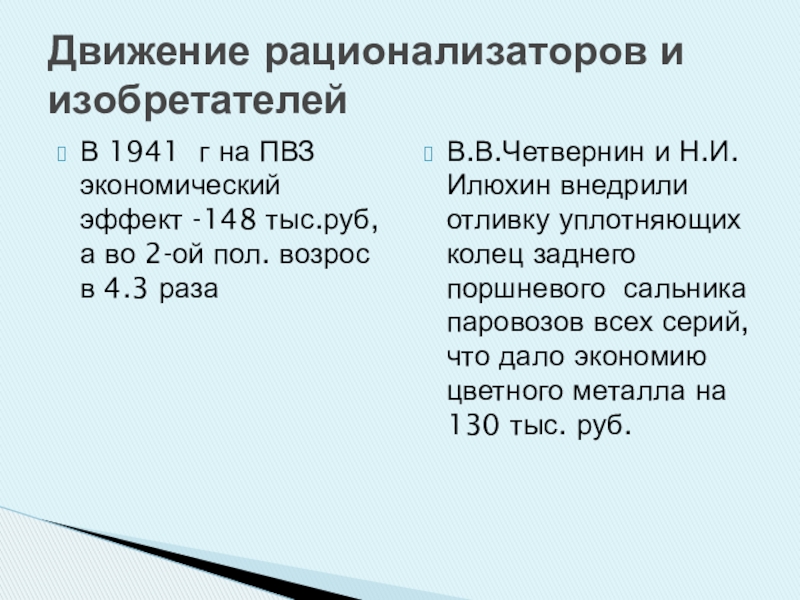 В.В.Четвернин и Н.И.Илюхин внедрили отливку уплотняющих колец заднего поршневого сальника паровозов всех серий, что дало экономию цветного металла на 130 тыс. руб.