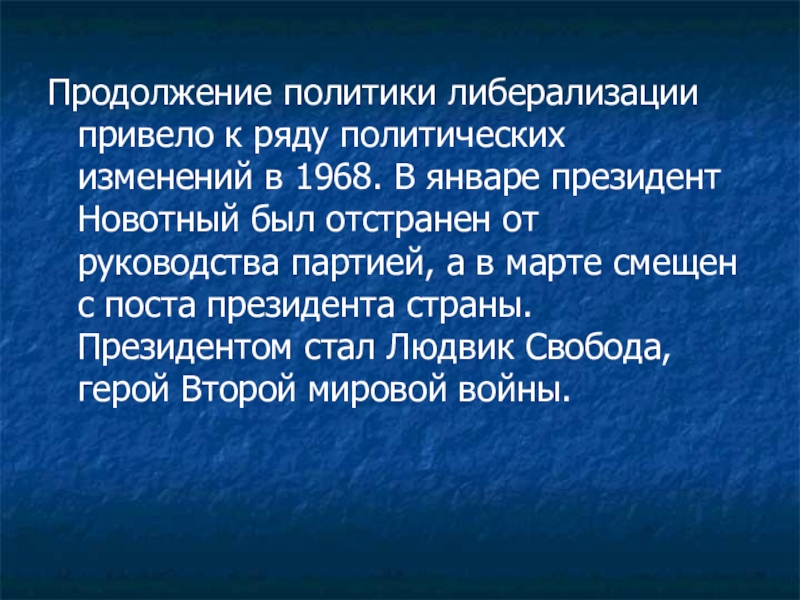 январе президент Новотный был отстранен от руководства партией, а в марте смещен с поста президента страны. Президентом стал Людвик Свобода, герой Второй мировой войны.