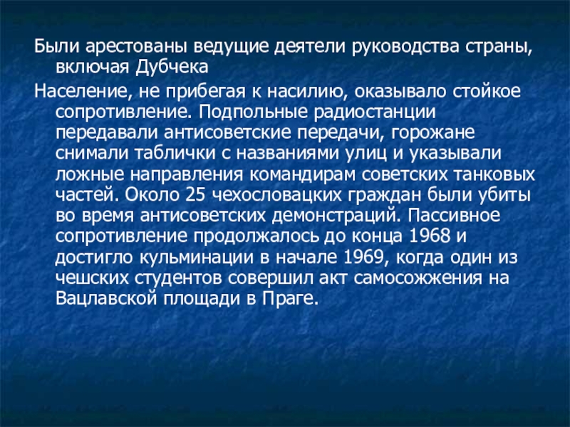 к насилию, оказывало стойкое сопротивление. Подпольные радиостанции передавали антисоветские передачи, горожане снимали таблички с названиями улиц и указывали ложные направления командирам советских танковых частей. Около 25 чехословацких граждан были убиты во время антисоветских демонстраций. Пассивное сопротивление продолжалось до конца 1968 и достигло кульминации в начале 1969, когда один из чешских студентов совершил акт самосожжения на Вацлавской площади в Праге.