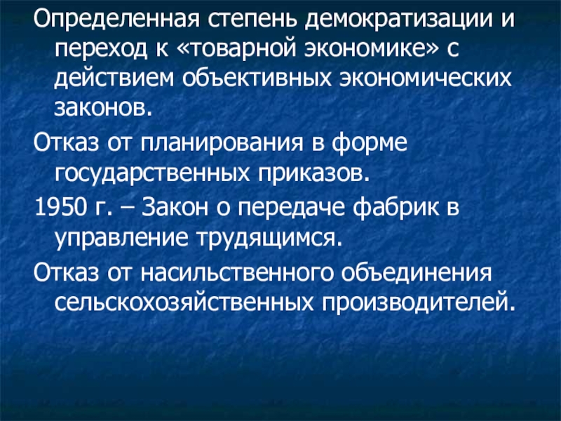 Слайд 27Определенная степень демократизации и переход к «товарной экономике» с действием объективных