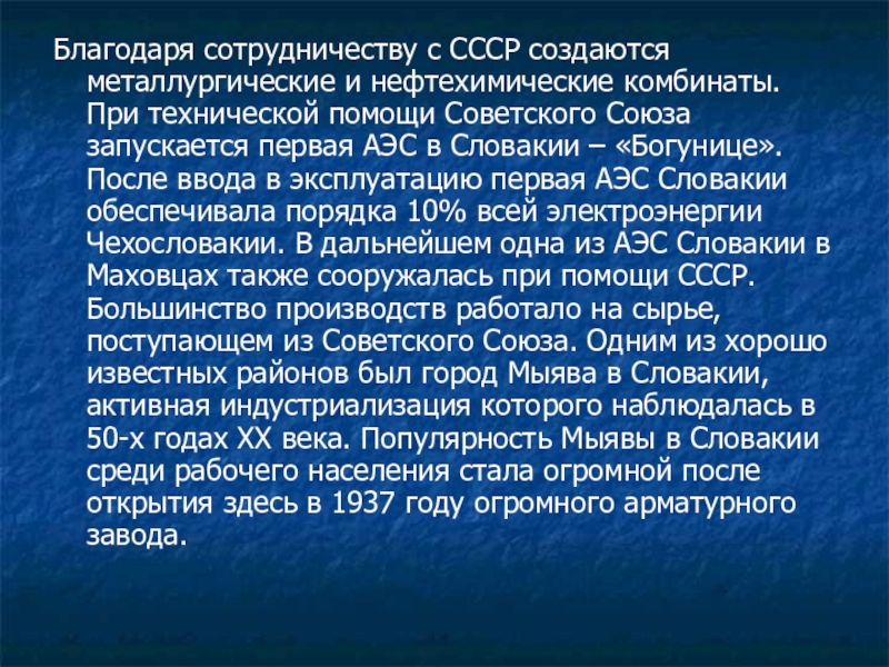 помощи Советского Союза запускается первая АЭС в Словакии – «Богунице». После ввода в эксплуатацию первая АЭС Словакии обеспечивала порядка 10% всей электроэнергии Чехословакии. В дальнейшем одна из АЭС Словакии в Маховцах также сооружалась при помощи СССР. Большинство производств работало на сырье, поступающем из Советского Союза. Одним из хорошо известных районов был город Мыява в Словакии, активная индустриализация которого наблюдалась в 50-х годах XX века. Популярность Мыявы в Словакии среди рабочего населения стала огромной после открытия здесь в 1937 году огромного арматурного завода.