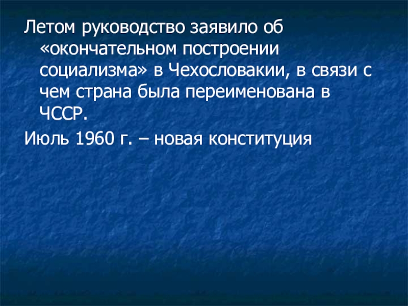 Слайд 14Летом руководство заявило об «окончательном построении социализма» в Чехословакии, в связи