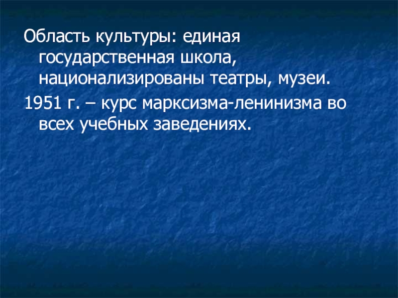Слайд 9Область культуры: единая государственная школа, национализированы театры, музеи.