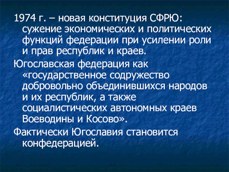 Слайд 361974 г. – новая конституция СФРЮ: сужение экономических и политических функций