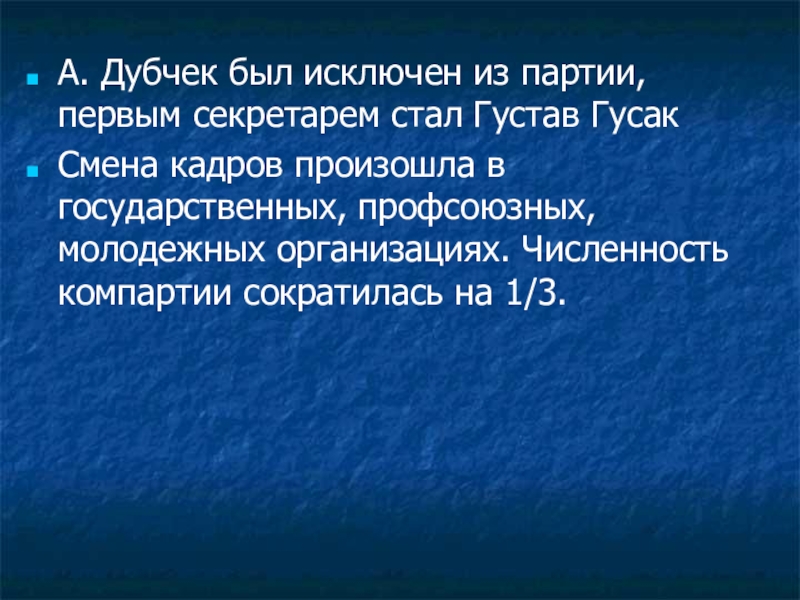 Слайд 22А. Дубчек был исключен из партии, первым секретарем стал Густав Гусак