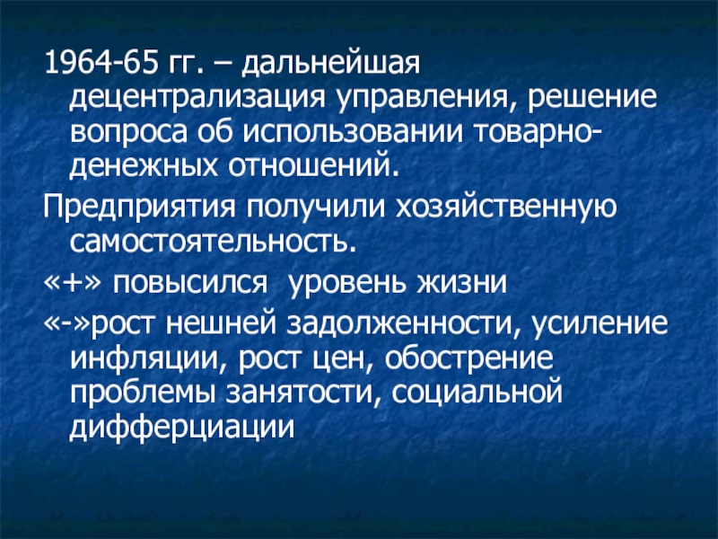 Слайд 341964-65 гг. – дальнейшая децентрализация управления, решение вопроса об использовании товарно-денежных