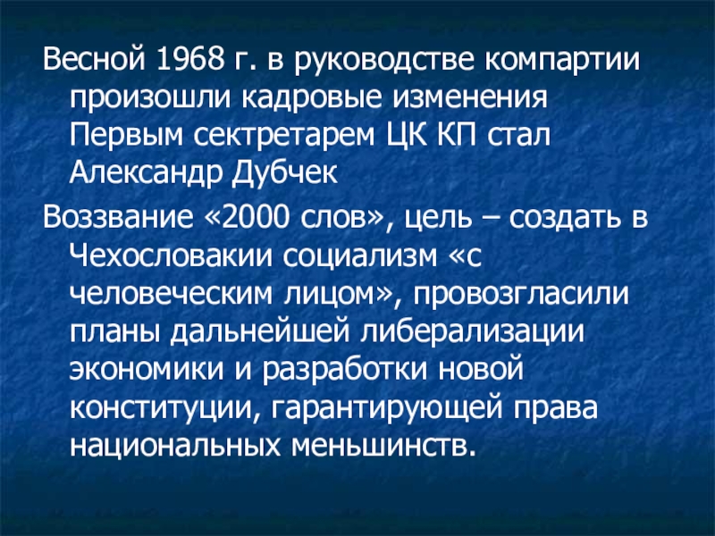 Воззвание «2000 слов», цель – создать в Чехословакии социализм «с человеческим лицом», провозгласили планы дальнейшей либерализации экономики и разработки новой конституции, гарантирующей права национальных меньшинств.