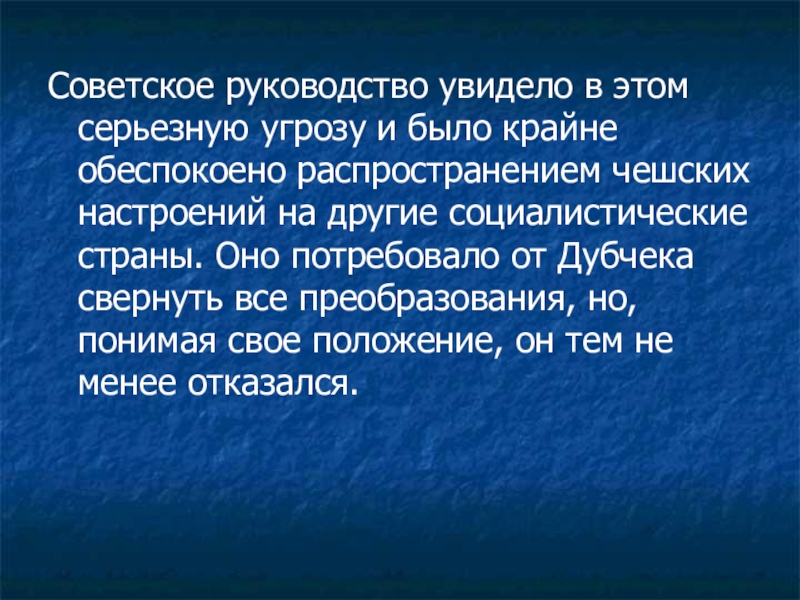 распространением чешских настроений на другие социалистические страны. Оно потребовало от Дубчека свернуть все преобразования, но, понимая свое положение, он тем не менее отказался.