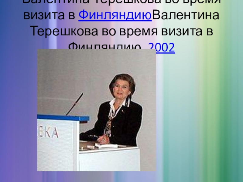 Слайд 9Валентина Терешкова во время визита в ФинляндиюВалентина Терешкова во время визита