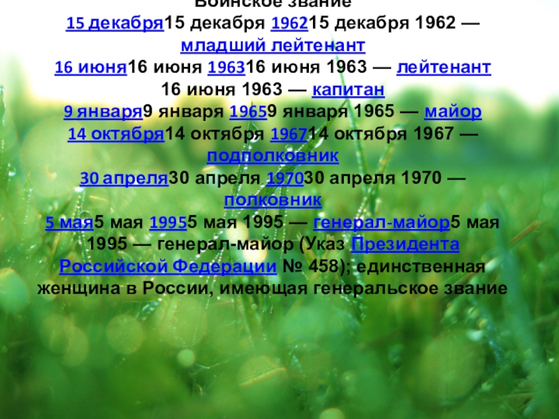 5 мая5 мая 19955 мая 1995 — генерал-майор5 мая 1995 — генерал-майор (Указ Президента Российской Федерации № 458); единственная женщина в России, имеющая генеральское звание