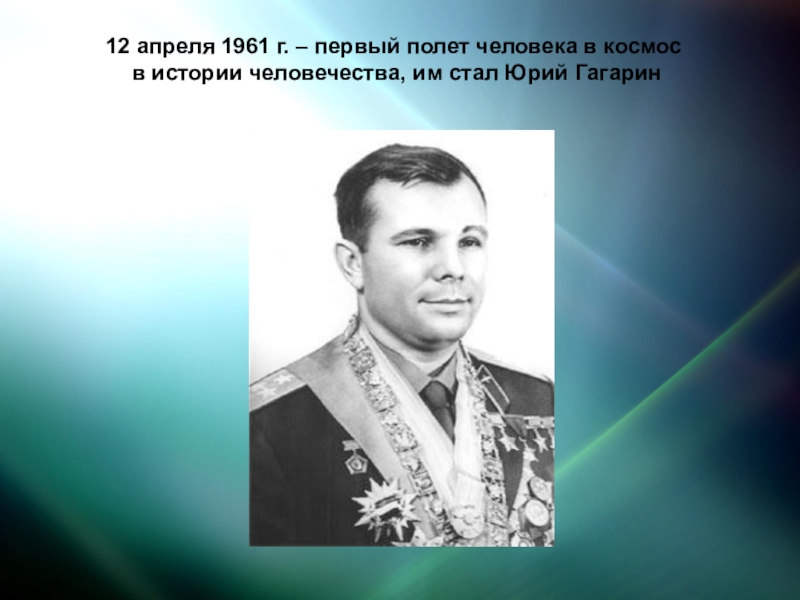 12 апреля 1961 г. – первый полет человека в космос в истории человечества, им стал Юрий Гагарин