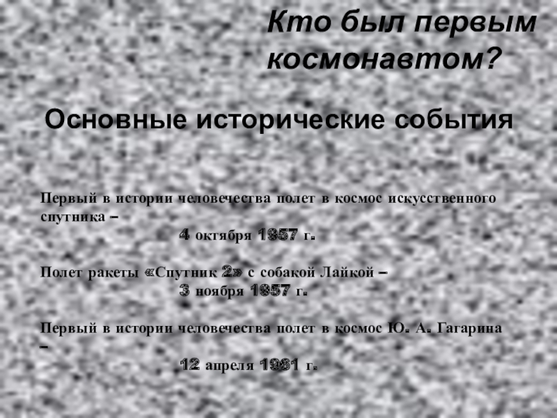 Основные исторические событияКто был первымкосмонавтом?Первый в истории человечества полет в космос искусственного спутника – 4 октября 1957 г.Полет ракеты «Спутник 2» с собакой Лайкой – 3 ноября 1957 г.Первый в истории человечества полет в космос Ю.