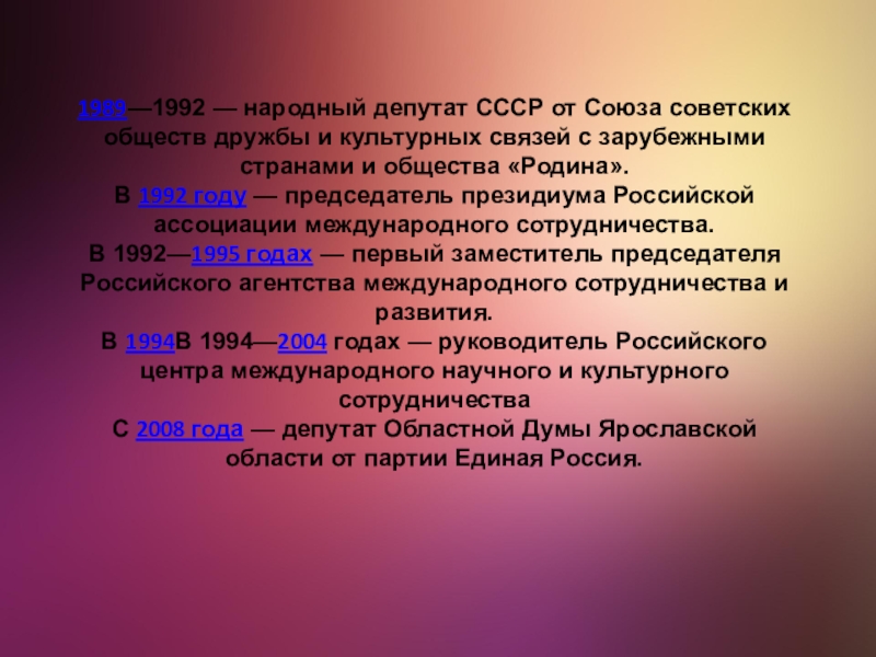 Слайд 101989—1992 — народный депутат СССР от Союза советских обществ дружбы и культурных