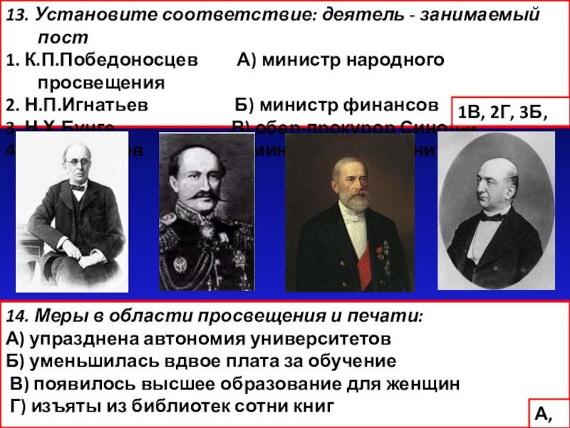 1) Н.Х.Бунге А) учреждение нового таможенного тарифа