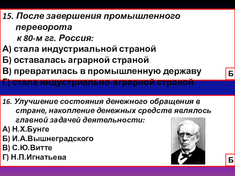 3) С.Ю.Витте В) снижение выкупных платежей с крестьян